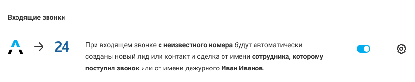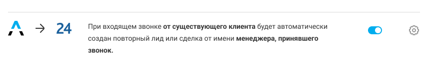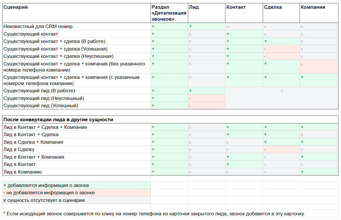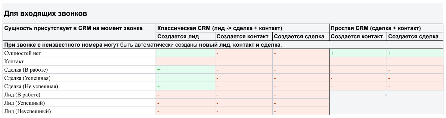 × Логика создания сущностей и добавления звонков в Битрикс24 Ниже описано как создаются сущности, добавляются звонки и их записи, а также прикреплены подробные таблицы, где вы сможете найти свой сценарий. 1. Чтобы при новом входящем или исходящем звонке в Битрикс24 автоматически создавался лид или сделка с контактом, нужно включить создание этих сущностей в АТС. Чтобы при исходящих также создавались сущности, включите их создание в разделе «Исходящие звонки». 2. Пока в Битрикс24 существует лид, сделка с контактом или отдельный контакт клиента, новые сущности при звонке не создаются автоматически. 3. Информация о звонках добавляется в открытую сущность и контакт. 4. Если лид или сделка закрыты (успешно или неуспешно), звонки продолжат добавляться к контакту. По умолчанию повторные лиды и сделки автоматически не создаются. 5. Чтобы для контакта или закрытых сущностей автоматически создавался повторный лид или сделка, нужно включить создание повторных лидов и в АТС, и в Битрикс24. Чтобы при исходящих также создавались сущности, включите их создание в разделе «Исходящие звонки». Только для исходящих: если предыдущий лид от этого клиента стал сделкой, то при звонке создаётся повторный лид. Если предыдущий лид стал контактом, то повторный лид не создается. Таблица 1. В какие сущности добавляются звонки и их записи в Битрикс24 Таблица 2. Как в Битрикс24 создаются сущности Посмотреть таблицу полностью. FAQ В какую сущность добавится звонок, если есть 2 открытые сделки с одним номером телефона? Звонок попадает в связанные сущности согласно таблице звонков независимо от количества связанных сущностей. В какую сущность добавится звонок, если есть открытая сделка и открытый лид с одним номером телефона? Звонок добавляется во все связанные сущности. Есть открытая сделка, лид, контакт. Сотрудник начинает звонок клиенту по клику из карточки контакта. В какую сущность добавится звонок? Звонок по клику на номер контакта считается обычным исходящим звонком и добавляется во все связанные сущности. Единственная особенность — если звонок совершается по клику из карточки закрытой сущности, такой звонок, будет добавлен еще и в эту карточку. Логика создания повторных лидов для исходящих и входящих отличается? Да, разница отображена в таблице выше.
