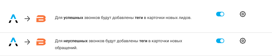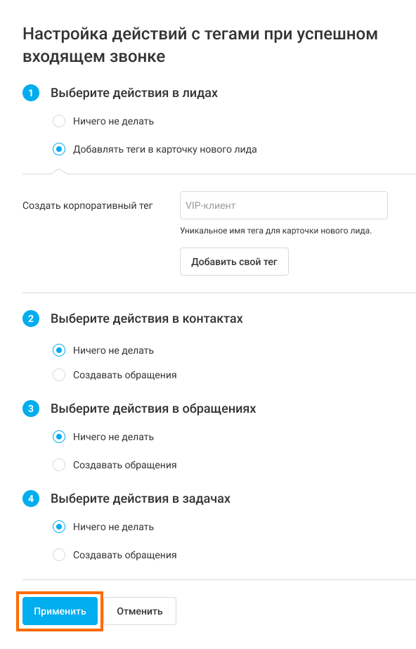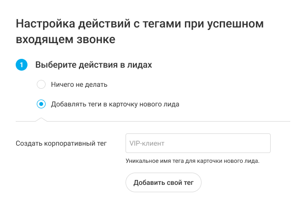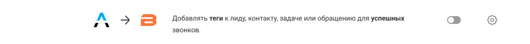 × Настройка тегов для звонков в интеграции АТС и BPMSoft Возможности интеграции АТС и BPMSoft Если в вашей АТС настроена интеграция с BPMSoft, то при звонках могут автоматически создаваться карточки лидов, контактов, задач и обращений. В такие карточки при необходимости могут подставляться теги — специальные метки для фиксации важных деталей звонка и быстрого поиска нужных данных по сделкам и контактам. Правила добавления тегов настраиваются отдельно для каждого типа звонков: входящих и исходящих, успешных и непринятых. Рассмотрим настройку на примере успешных входящих звонков. 1. В выбранном сценарии интеграции в блоке «Входящие звонки» включите добавление тегов. 2. В открывшемся окне выберите, что делать при успешном входящем звонке: добавлять или не добавлять теги в лиды, контакты, задачи и обращения. Добавление тегов для каждого типа карточек настраивается отдельно друг от друга. 3. В открывшемся меню создайте корпоративный тег, например: VIP-клиент — для обозначения звонков от ключевых клиентов. Срочный заказ — чтобы отмечать запросы на быструю обработку. Жалоба — помогает отслеживать жалобы для их проработки. Затем сохраните изменения, нажав «Применить». 4. Если нужно изменить добавленное правило, нажмите на шестеренку. Правила добавления тегов при непринятых вызовах настраиваются так же, как и при успешных звонках.