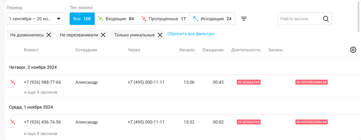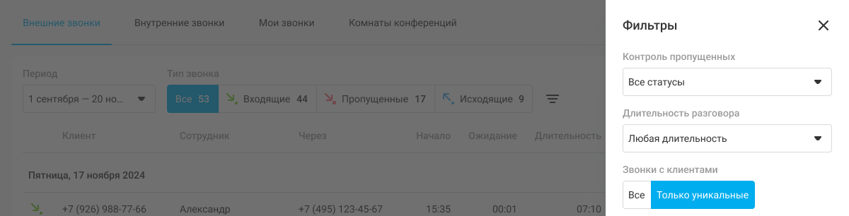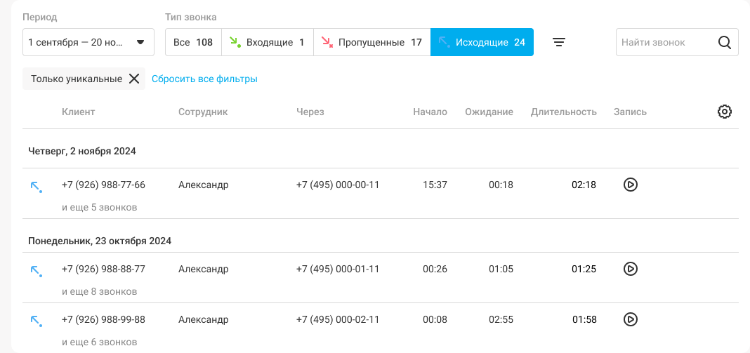 × История и запись звонков АТС поможет вашей компании контролировать телефонные продажи. История звонков (детализация) – один из важнейших разделов АТС, где отображаются все звонки ваших сотрудников. В историю звонков попадают все входящие и исходящие звонки с мобильных, SIP-телефонов и софтфонов, включая внутренние разговоры между сотрудниками одной АТС и между филиалами. Здесь вы можете: фильтровать звонки по клиентам, отделам, сотрудникам, типам вызовов, длительности и т.д. за нужный период; видеть базовые статистические данные в соответствии с фильтрами; отслеживать звонки, которые заслуживают особого внимания (пропущенные вызовы, по которым не перезвонили или перезвонили, но не дозвонились; звонки с оценкой качества обслуживания); прослушать записи разговоров и скачать их себе на компьютер; распечатать детализацию звонков; выгрузить историю в Excel для построения индивидуальных отчетов; оставлять заметки к звонкам, когда важно не забыть детали. Чтобы создать заметку, во время прослушивания записи разговора нажмите на иконку рядом с кнопкой «Скачать». Обратите внимание1. Возможности просмотра истории звонков зависят от уровня прав пользователя. 2. Время начала звонка показывается в часовом поясе компании. Подробнее о выборе часового пояса читайте в статье «Часовой пояс». Как быстро посмотреть историю звонков менеджера Нажмите на имя сотрудника в таблице или введите его в поле «Найти звонок», и вы можете посмотреть историю звонков конкретного менеджера за выбранный период. Как быстро посмотреть историю звонков по клиенту Можно нажать на имя или номер клиента, а также введите его в поле «Найти звонок» и вы получите все его звонки в вашу компанию за выбранный период. Чтобы в истории отображались имена клиентов, добавляйте их в книгу контактов. Как не записывать звонки руководителя и предупреждать клиента о записи? Как использовать больше фильтров Нажмите на кнопку «Фильтры», чтобы открыть панель фильтров. С ее помощью можно отфильтровать звонки не только по клиентам, сотрудникам и номерам, но также: по отделам; статусам обработки пропущенных вызовов; длительности вызовов; времени поступления вызовов. Откроется боковая панель с фильтрами. Выберите нужные вам значения фильтров и нажмите «Применить». В таблице останутся только те звонки, которые соответствуют заданным вами параметрам. Так удобнееЕсли смотреть Историю звонков на широком экране (больше 1836 пикселей в ширину), то панель с фильтрами будет открыта по умолчанию. Как фильтровать пропущенные звонки Чтобы в режиме реального времени следить за тем, какие неотвеченные звонки уже обработаны, а какие нет, используйте фильтр «Контроль пропущенных» и цветные метки в таблице со статусом пропущенного. Обратите вниманиеФильтр «Контроль пропущенных» отображается в панели фильтров, когда выбраны типы звонков «Все», «Входящие» или «Пропущенные». При выборе типа звонков «Исходящие» фильтр «Контроль пропущенных» недоступен. Благодаря фильтру «Контроль пропущенных» вы сможете легко найти непринятые звонки, на которые сотрудники не перезванивали или не дозвонились. Цветные метки статусов обработки пропущенных звонков размещены в крайнем правом столбце таблицы. Эти метки помогут понять, в каком статусе находится каждый неотвеченный звонок: перезвонил ли менеджер кл