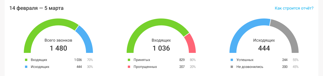 В отчете отображаются сводные данные обо всех звонках за выбранный период (день, неделя, месяц и т.д.). Каждый из счетчиков отвечает на ключевые вопросы руководителя: